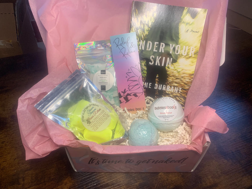 The Relax & Relief box is a one-time box (not a subscription) containing soothing bath and body items that also help relieve common colds and sinus issues. Your box will include 1 paperback book in the genre of your choice, a bookmark, access to 15+ romance ebook downloads, and 4 bath and body items.